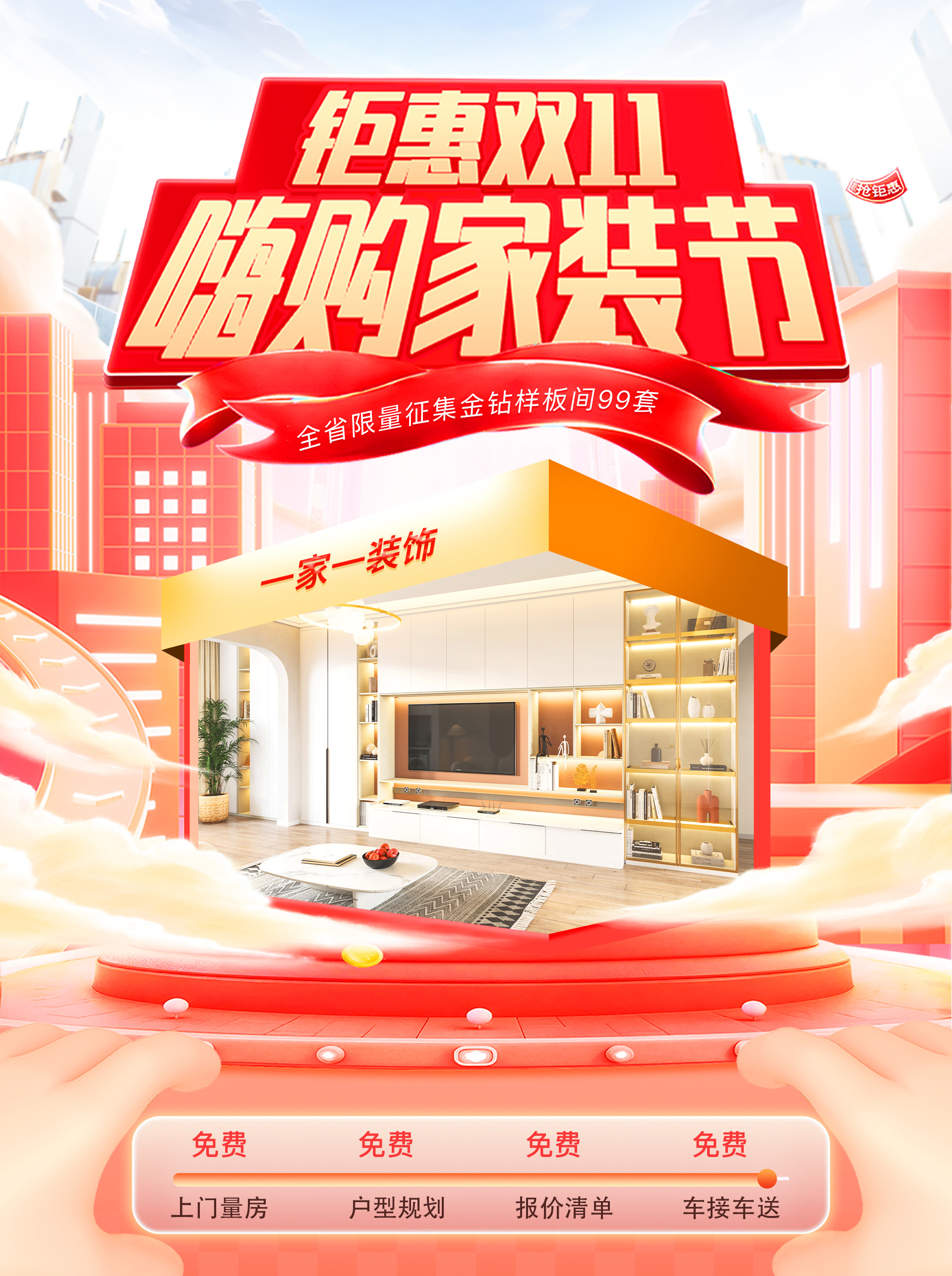 一家一裝飾雙十一活動現向全省召集金牌樣板間,現在定裝修,可享5000元裝修抵用金,機會不等人,今年最后一次盛大優惠!